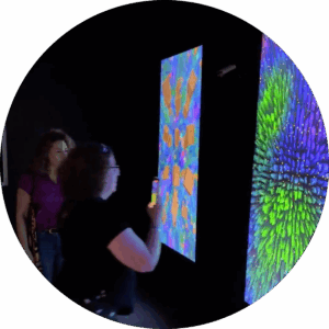 Blooming Orb features a field of luminous, reflective spheres that respond fluidly to visitor movement. Proximity causes the orbs to ripple, glow, and transform, while bees and honeycomb patterns emerge and disperse across the screen. This focused, screen-based interaction distills the original immersive environment into a playful, responsive moment—inviting visitors of all ages to awaken a living digital surface through motion alone.