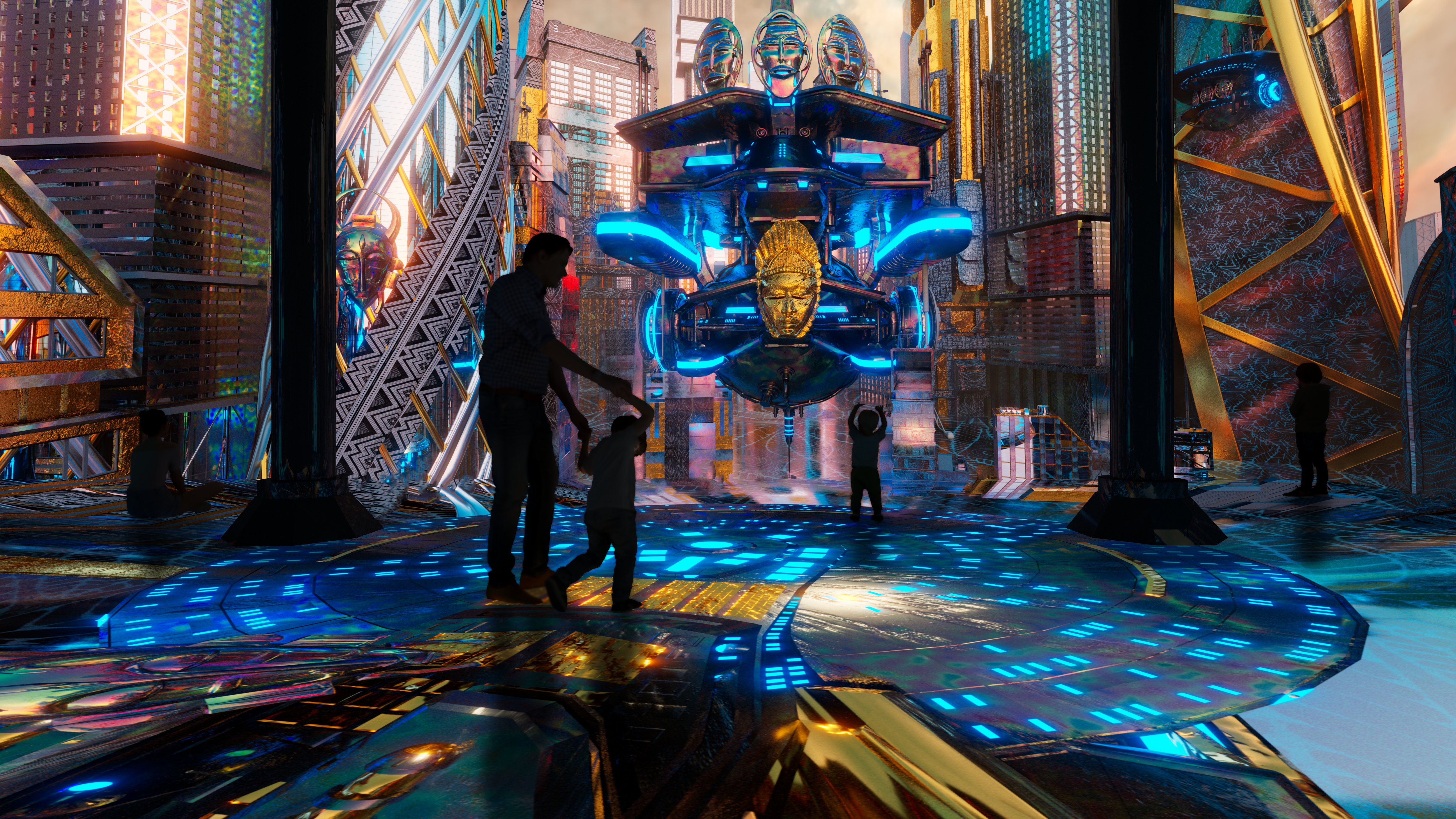 The core cinematic experience is supported by interactive auxiliary galleries exploring the exhibition’s themes of rebirth, community, and spiritual connection, such as Thousand Masks, an audio-visual piece that celebrates the diversity of culture found throughout Africa; and Afrikanism, an interactive, futuristic African map that shifts and echoes below the visitors’ feet with captivating reimaginations of the African continent.