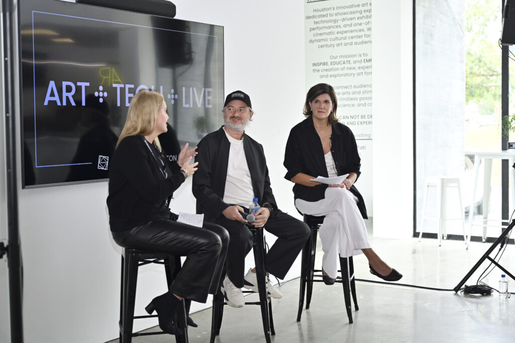 Left photo, from left to right: Svetlana Legetic (Moderator, Exactly Agency), Dr. Anita N. Bateman (Museum of Fine Arts Houston), Christie Vasquez-Martin (Meow Wolf), Sandro Kereselidze (Founder and Chief Creative Officer of ARTECHOUSE), Erick Calderon (Art Blocks).