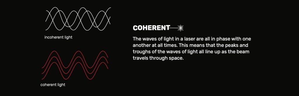 Lasers are unique because they are coherent, which essentially means that their waves are all in phase with one another, or, synchronized—the peaks and troughs of the waves all align and never intersect.